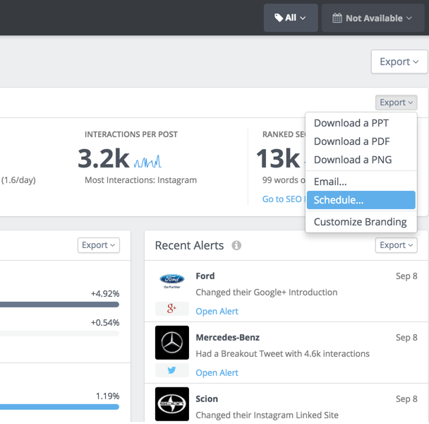 To get started with scheduling an export, just look for the Export button on any report in Rival IQ. You’ll notice that the options available have increased, and that “Schedule” is now available. Click the schedule option to configure your export.