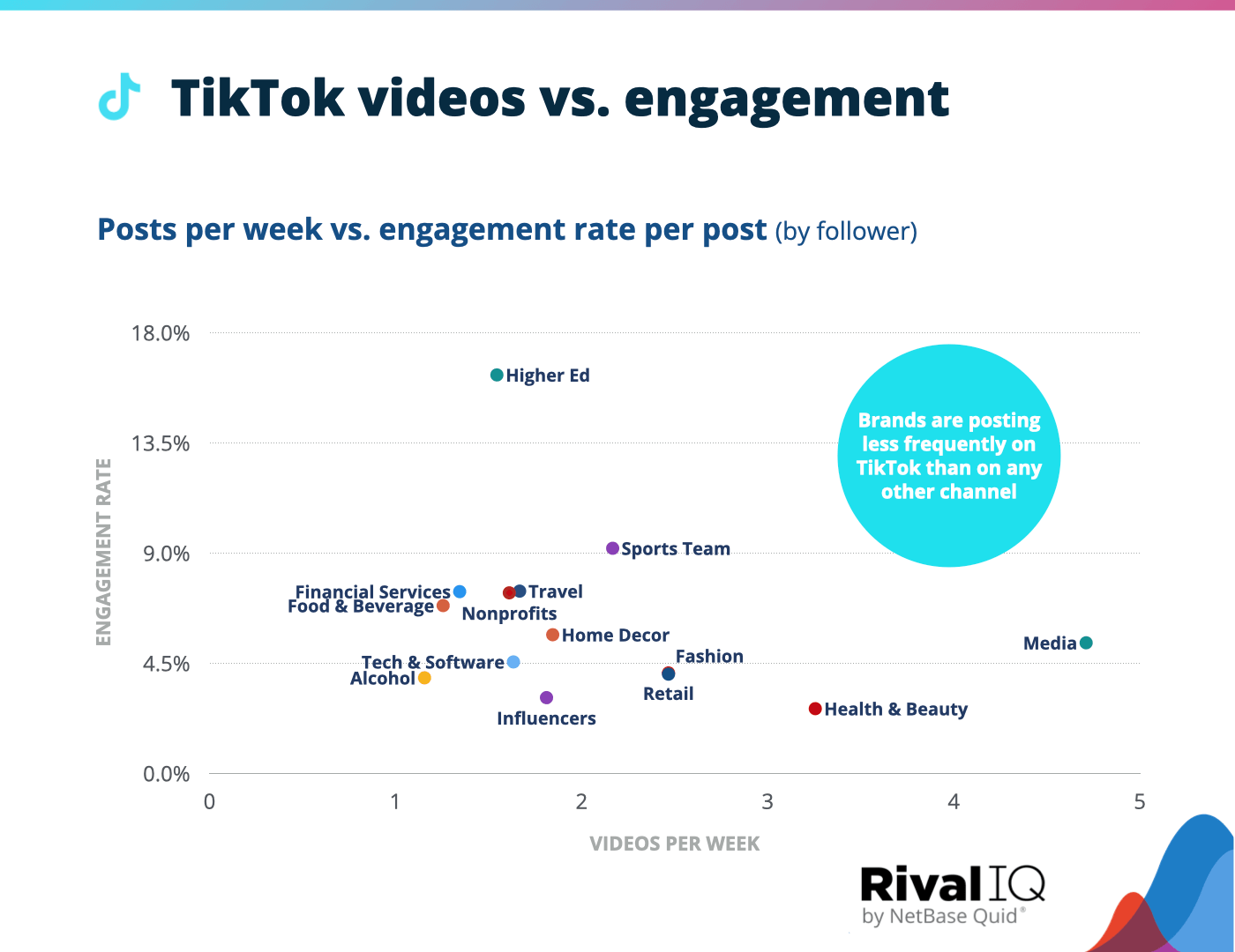 Higher Ed sees epic engagement rates on TikTok but is one of the least frequent posters, while Media brands’ lagging engagement rates prove once again that more posting isn’t necessarily better.