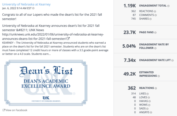 When the University of Nebraska at Kearney shared the names of students who made the dean’s list for the 2021 fall semester, the post was shared a whopping 745 times — over double the number of times as their NCAA National Championship post.