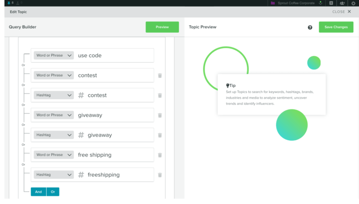 Pros: Current Sprout customers will love being able to up their listening game without leaving Sprout’s colorful confines. Track by campaign, topic, or hashtag, and easily keep an eye on how the internet is talking about your competition.