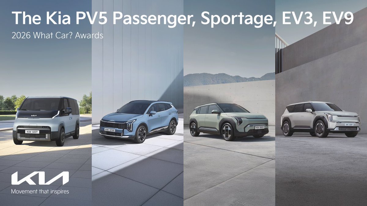 Kia celebrates four major wins at the 2026 What Car? Awards Best MPV - PV5 Passenger Best Family SUV - Sportage Best Small Electric SUV - EV3 Best Electric Seven-seat SUV - EV9 Designed for life. Inspired by every journey. #Kia #PV5 #Sportage #EV3 #EV9 #MovementThatInspires pic.x.com/vrdGcrcoho