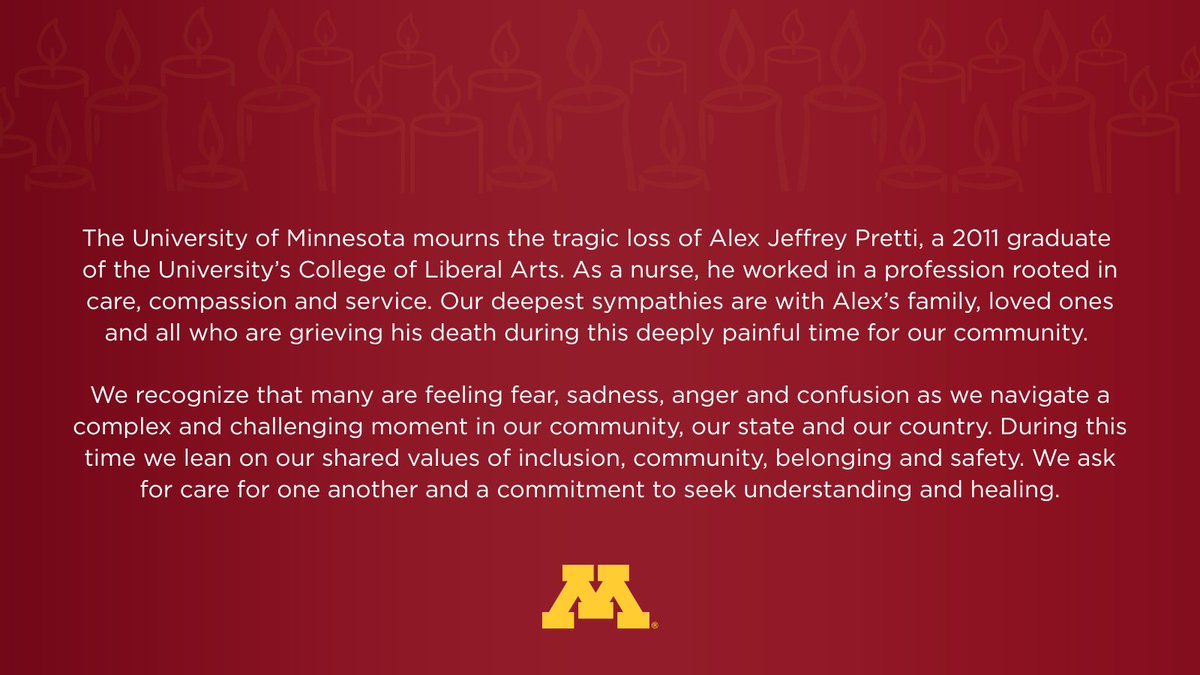 The University of Minnesota mourns the tragic loss of Alex Jeffrey Pretti, a 2011 graduate of the University’s College of Liberal Arts. During this time we lean on our shared values of inclusion, community, belonging and safety. We ask for care for one another and a commitment to pic.x.com/JCIk0H46yD