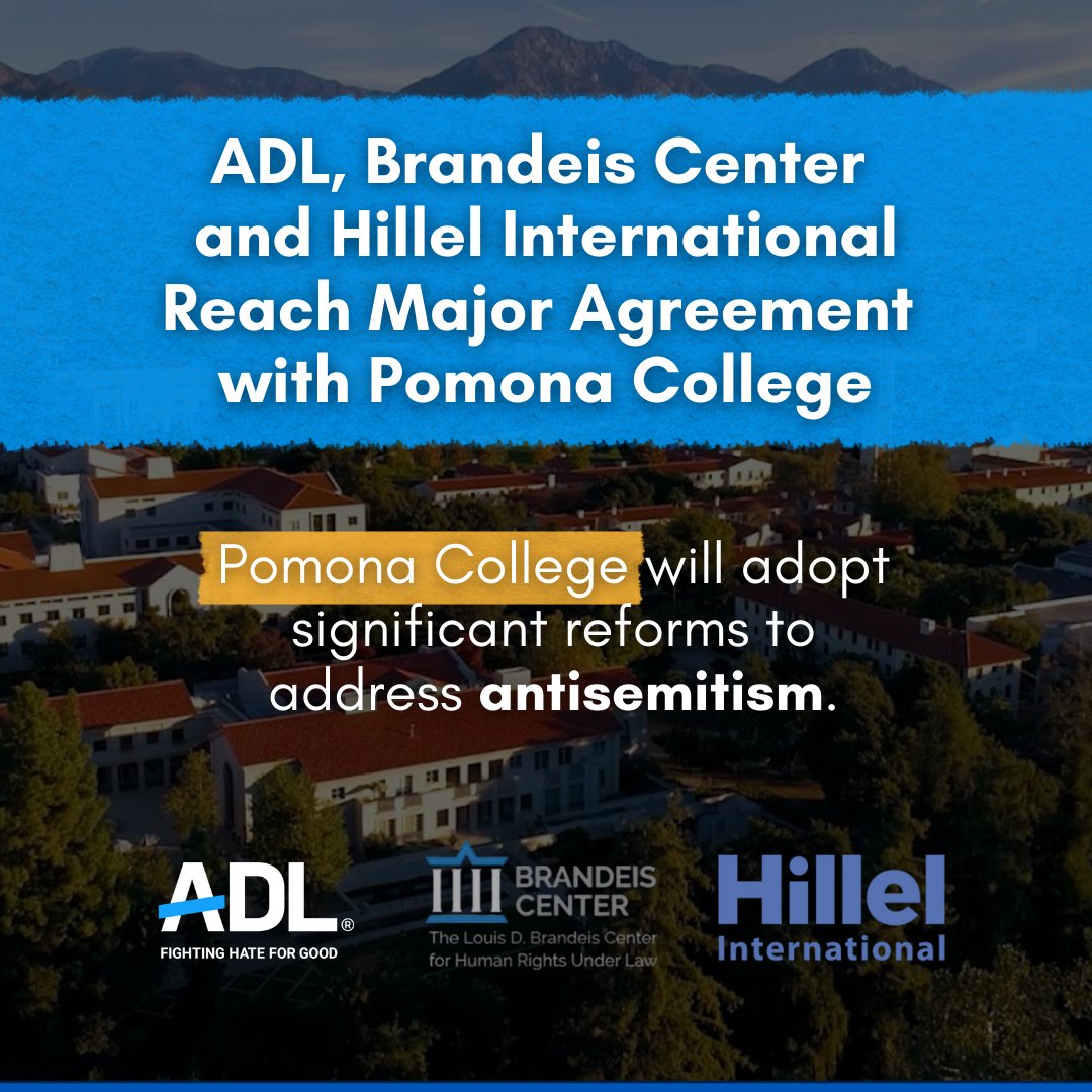BREAKING: ADL, brandeiscenter and hillelintl have reached a settlement with PomonaCollege to resolve claims that the college permitted severe discrimination and harassment of Jewish students in violation of Title VI of the Civil Rights Act. Pomona agreed to adopt significant campus reforms to address antisemitism and improve anti-discrimination protections for Jewish and Israeli students. Learn more about …
