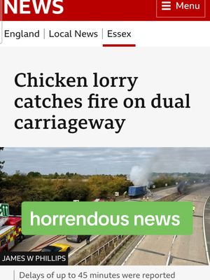 Horrendous scenes this week as a chicken lorry catches fire, and yet this article doesn't include a single reference to the welfare of the birds.💔 Every single one of the chickens on this lorry was an individual. A sentient being who could feel pain and joy, but all too often, they're dismissed and viewed as objects. …
